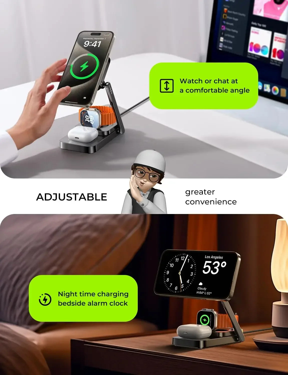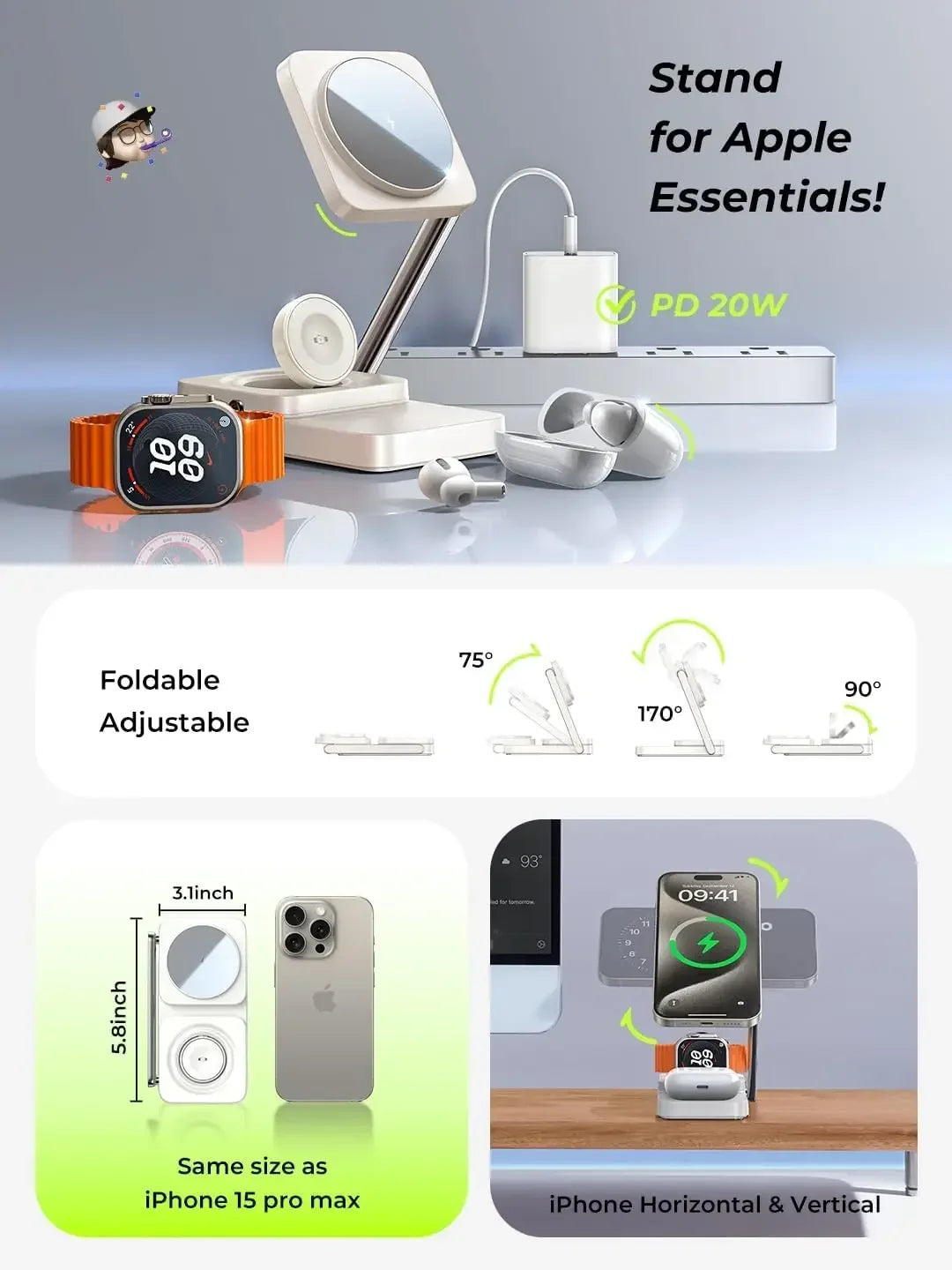 Compatible with iPhone 12 and later that supports MagSafe, Apple Watches (all series), and AirPods 2nd generation with wireless charging case and AirPods Pro